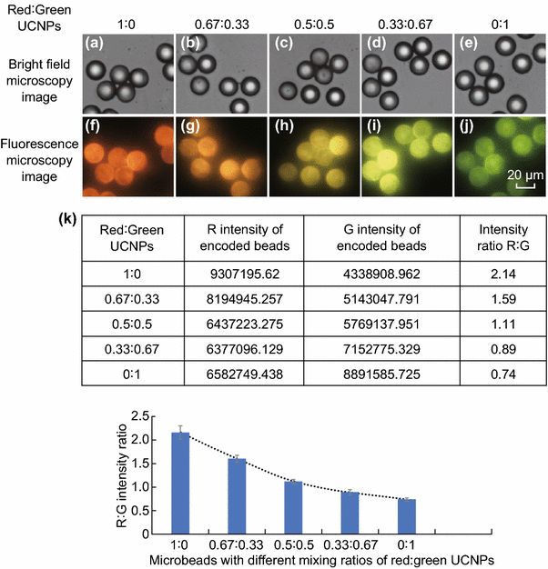 用羧基改性的NaYF4:50%Yb, 1%Er和NaYF4:18%Yb2%Er30%Lu UCNPs编码微球的明场显微镜图像及其相应的荧光显微镜图像(在40倍放大下)。比例分别为a, f) 1:0; b, g) 0.67:0.33; c, h ) 0.5:0.5; d, i)0.33:0.67和e, j) 0:1; k)从每个微球(顶部)计算得到的红色和绿色强度比率 (底部)(数据代表平均值±SD; n = 20个微珠)。