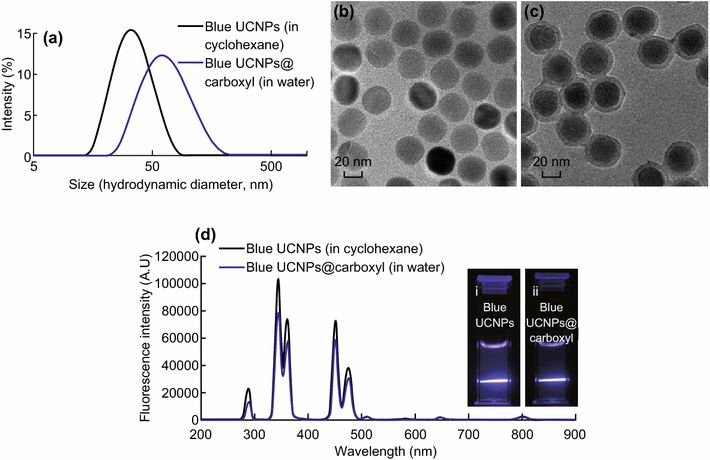 a) 在环己烷和水中羧基改性和未改性的NaYF4:30%Yb0.5%Tm UCNPs的尺寸分布;b) 在环己烷中的NaYF4:30%Yb0.5%TmUCNPs的TEM图像; c) 在水中的NaYF4:30%Yb0.5%Tm@carboxyl UCNPs的TEM图; d)NaYF4:30%Yb0.5%Tm UCNPs的发射荧光光谱,分别在环己烷和水中表面改性和未改性,插图(i)NaYF4:30%Yb0.5%Tm(ii)NaYF4:30%Yb0.5%Tm羧基UCNP相应的照片。