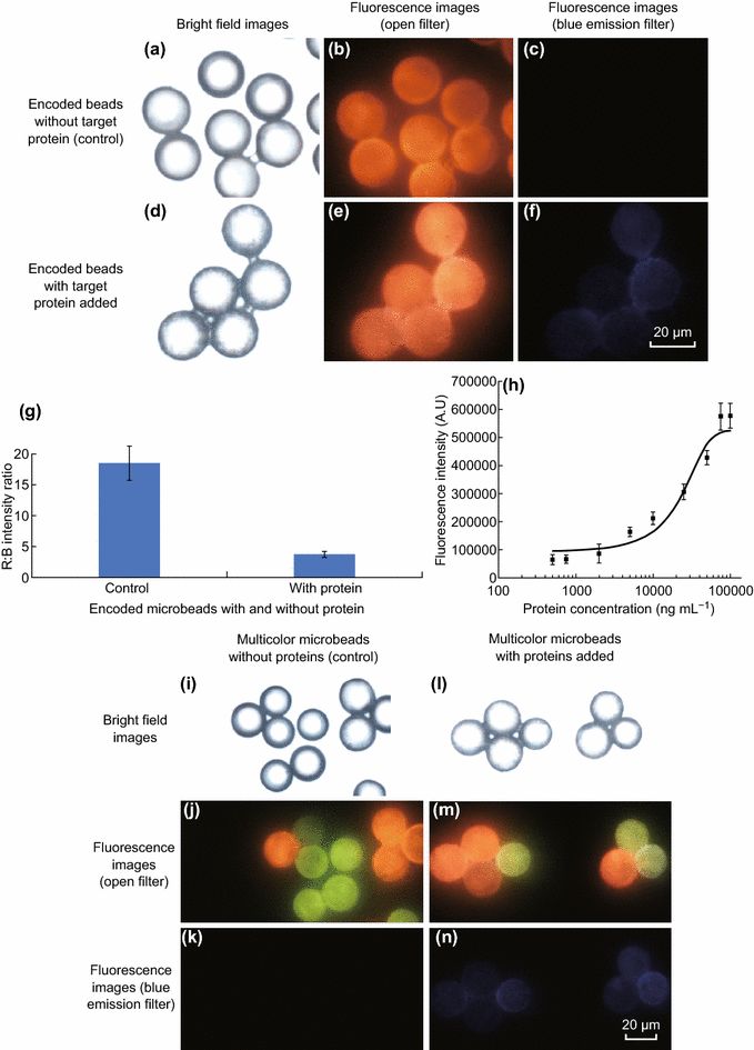 使用NaYF4:50%Yb1%Er和NaYF4:18%Yb2%Er30%Lu UCNPs编码的多色微球对靶蛋白HSA和hCRP进行多重检测。明场图像和相应的开放式过滤器和用于收集基于编码微球检测的蓝色发射过滤器的荧光图像,用于i,j,k) 不添加靶蛋白(对照)和l,m,n) 添加靶蛋白。