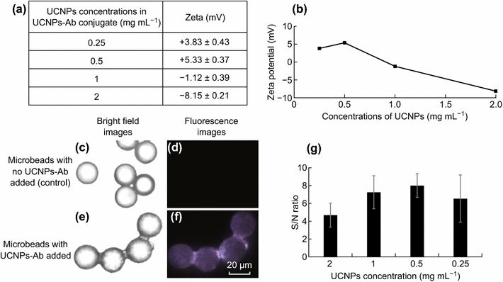 a) 在不同浓度的UCNPs下,UCNPs-Ab共轭物的不同表面电荷;b) 表面电荷对UCNPs-Ab共轭物中UCNPs浓度的图像;c, e)明场图像( 不添加UCNPs-Ab和添加UCNPs-Ab );d, f)荧光显微镜图像(放大倍数为40倍,不添加UCNPs-Ab和添加UCNPs-Ab );g) 在结合反应中使用不同浓度UCNPs的UCNPs-Ab对应的S/N比 (数据代表平均值±SD; n = 20个微球)。