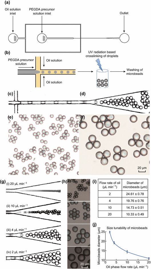 a) 液滴微流体装置的AutoCAD设计;b) 微流控液滴合成微球的机理;c, d) 使用微流体装置产生水凝胶的明场显微镜图像;e, f) 在10倍和20倍放大倍数交联水凝胶后形成的微珠的明场显微镜图像;g) 在微流体通道中以不同流速的油形成水凝胶;h) 相应微球的明场显微镜图像(在40倍放大,曝光=10ms,增益=4x);i) 在不同的油流量下形成的微球直径;j) 对应的图表显示与不同油流量的关系(数据代表平均值±SD; n = 50个微球)。