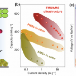 图6. 用正负离子选择膜对进行渗透能转换。a采用CNFC-PAAS-AAS膜和CNFC-DMC-AAS膜组成的三腔体电化学电池。b中心高浓度和中心低浓度两种配置方式下的三腔体I-V曲线。c真实河水和海水的电流密度和输出功率密度。d CNFC-PAAS-AAS与CNFC-DMC-AAS膜交替的串联堆叠RED器件示意图。e RED系统的电压随电池单元的数量而变化。f三腔体电池(红星)与最先进渗透发电机的发电性能比较。
