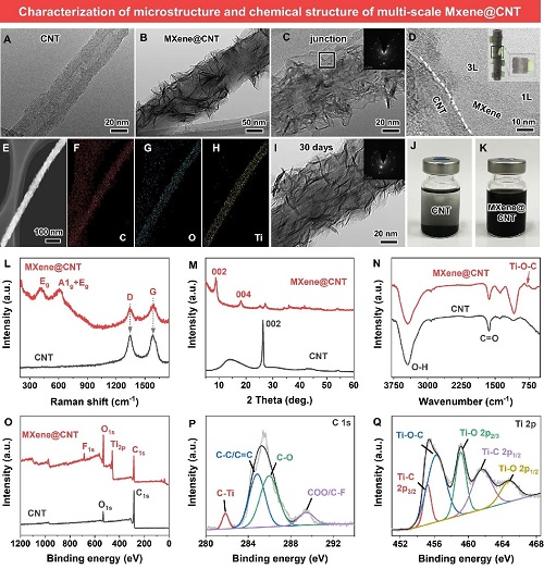 通过SEM/TEM系统解析了MXene@CNT异质结构的形貌演化规律。对比显示:原始CNT表面光滑(图2A),改性后呈现典型多尺度树枝状拓扑结构(图2B),二维MXene纳米片通过剪切组装在一维CNT表面形成梯度包覆。HRTEM揭示单层及少层MXene通过Ti-O-C共价键与CNT形成紧密耦合的异质结构(图2C-D),高角环形暗场像及EDS元素映射(图2E-H)证实C/O/Ti元素的空间连续分布,验证MXene的均匀锚定。值得注意的是,30天环境暴露后异质界面仍保持完整晶格结构(图2I),证明其抗氧化稳定性。分散实验进一步显示,MXene@CNT在BDO溶剂中抗团聚性能显著优于原始CNT(图2J-K)。