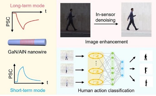 总之,本工作受神经元“线条式”结构及神经元工作原理启发,构建了基于氮化镓纳米线结构的仿生视觉传感器,模拟了生物突触中类似的“记忆效应”。该氮化镓基仿生传感器不仅能够模拟生物视觉系统中的长期记忆和突触可塑性,还能在图像识别中发挥强大的预处理与增强作用,最终实现高效、精准的动作分类。