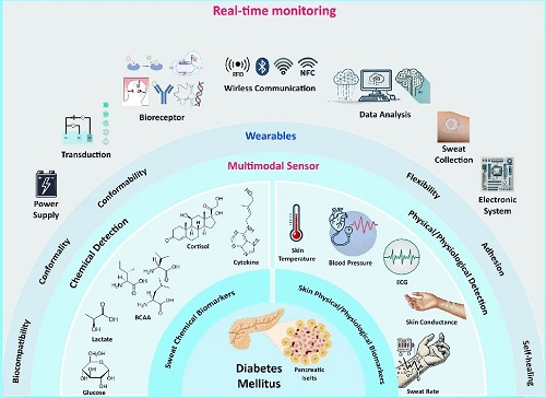 糖尿病是一个重大的全球健康问题,推动了对传统血糖监测方法的无创替代方案的需求。可穿戴技术的最新进展引入了能够分析汗液和皮肤生物标志物的皮肤接口生物传感器,为糖尿病诊断和监测提供了创新的解决方案。英国曼彻斯特大学Yi Li等人全面讨论了无创可穿戴生物传感器的当前发展,强调同时检测生化生物标志物(如葡萄糖、皮质醇、乳酸、支链氨基酸和细胞因子)和生理信号(包括心率、血压和出汗率),以实现准确、个性化的糖尿病管理。作者探索多模态传感器设计、材料科学、生物识别元件和集成技术方面的创新,强调高级数据分析、人工智能驱动的预测算法和闭环治疗系统的重要性。此外,本综述还解决了生物标志物验证、传感器稳定性、用户合规性、数据隐私和监管考虑方面的持续挑战。基于此,下一代可穿戴生物传感器实现的整体、多模式方法在改善患者预后和促进糖尿病管理中的主动医疗保健干预方面具有巨大潜力。