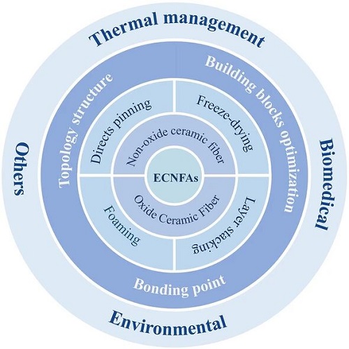 图1. 源自不同制备方法及结构特征的ECNFA在多领域应用示意图。差异化设计的ECNFA分别应用于热管理、环境领域、生物医学领域及新兴领域。
