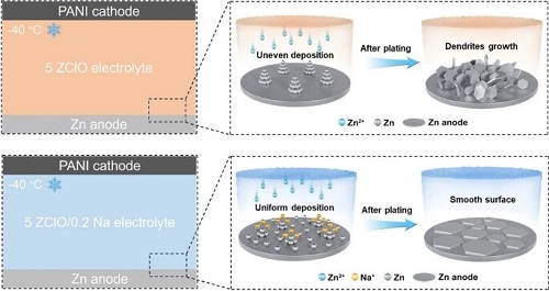 2. 具有低离子势的 Na⁺ 能自发吸附在负极–电解液界面上,有效减少溶剂化水分子并抑制副反应的发生,从而在低温条件下显著提高水系锌金属电池的库仑效率。