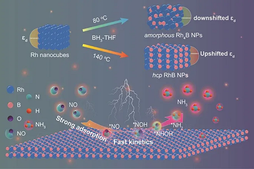电催化一氧化氮还原反应(NORR)以水为氢源,在常温常压下将NO转化为高附加值的氨气,既可实现污染物的回收转化,又提供了可替代高能耗的哈伯-博斯法生产氨气的新途径,展现出巨大的应用潜力。目前,NORR技术的发展仍受限于高效催化剂的稀缺。近年来,纳米材料相工程为催化剂设计提供了新思路。例如,通过向金属晶体中掺杂硼等轻非金属元素,可同时影响被嵌入金属的晶相与电子结构,进而调控其催化性质。然而,现有非金属掺杂方法通常条件苛刻,限制了纳米催化剂相工程的精准设计与性能优化。因此,开发温和条件下、可控制备的新型非金属掺杂催化剂,不仅能突破NORR高效催化剂稀缺的瓶颈,更能深化对电催化中晶相效应机理的理解。