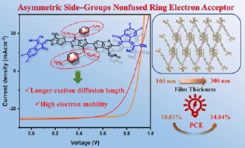 总之,非对称侧链的分子设计策略为开发低成本、高性能NFREA提供了全新思路,对推动OSCs向高效率、厚度容忍型方向的发展具有重要的科学价值与应用潜力。