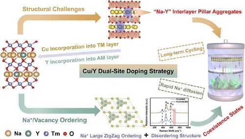 钠离子电池层状氧化物正极材料面临着结构退化、容量衰减和动力学迟滞等一系列问题,严重制约着其实际应用。浙江大学吕建国团队(王旭博士为第一作者),联合英国伦敦南岸大学 (London South Bank University) 、浙江大学衢州研究院、浙江华电器材检测研究院等科研单位,开展创新研发,不同于以往集中于对过渡金属层的调控,而是提出Cu/Y双位点掺杂策略,成功实现了对层状氧化物的过渡金属层和碱金属层的同步优化。Y金属离子与周围的Na⁺形成了稳定的新型层间聚集体型支柱,该驻点显著增强了层间结构的稳定性,有效抑制了P2-O2相变。此外,Cu/Y双掺杂破坏了原有的Na⁺/空位有序排列,形成一种有序与无序共存的钠离子分布状态,显著提升了Na⁺扩散动力学。材料在充放电过程中表现出极小的晶格体积变化,实现了结构的高度可逆性和循环稳定性。该策略及新型聚集体型层间支柱概念为层状氧化物正极的碱金属层间支柱工程提供了新的视角,并为钠离子有序及无序排布的共存态对钠离子传输动力学的有益作用提供了新见解。