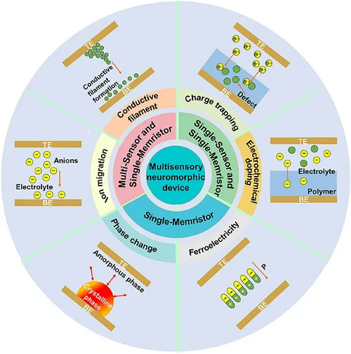 神经形态器件通过离子迁移实现多模态感知的核心机制在于离子迁移对多物理场刺激的高度敏感性及其动态可重构性。这一能力源于离子运动的统一物理机制,该机制能够将来自光、电、热、化学、压力等多种能量模态的输入信号,转化为非线性电导或电阻变化,从而模拟生物突触的可塑性。离子迁移本质上具备多物理场耦合特性:因其对多种能量模态响应灵敏,可自然充当多模态信号的转换媒介。无论外部刺激形式如何,最终都通过调控离子迁移速率或路径来改变材料的电导率,实现跨模态信号转换。此外,离子迁移的动态可重构性进一步扩展了器件功能。外部场(如电场、光场)能够实时调控离子迁移路径与空间分布,使器件具备自适应感知与学习能力。例如,通过光强和电场的协同调控,可调整氧化物材料中氧空位的迁移行为,从而按需在光学感知模式与电学感知模式之间切换。这种可重构性模拟了生物系统依据环境背景优先处理不同感官输入的能力,为发展情境感知神经形态计算奠定了基础。