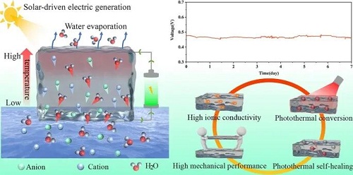 全球能源危机与电力短缺问题日益严峻,开发可持续、清洁的能源转换技术势在必行。太阳能作为一种取之不尽、用之不竭的绿色能源,已成为解决能源问题的重要方向。近年来,太阳能蒸发器与发电的结合展示了太阳能驱动水蒸发技术实现可持续发电的潜力。然而,发电装置的水蒸发率低和其集成系统通常由复杂且缺乏弹性的独立模块组装而成,这不仅损害了太阳能蒸发和发电效率,也缺乏满足复杂应用条件的灵活性。此外,由于实际应用中的扭转、撕裂、摩擦和压缩,太阳能发电设备不可避免地容易受到机械损伤,这大大缩短了设备的使用寿命并影响了功能可靠性。因此,如何实现优异水蒸发率-输出电压-柔韧性-光热自愈合一体化集成依然是延长装置寿命和缓解能源危机的关键挑战。