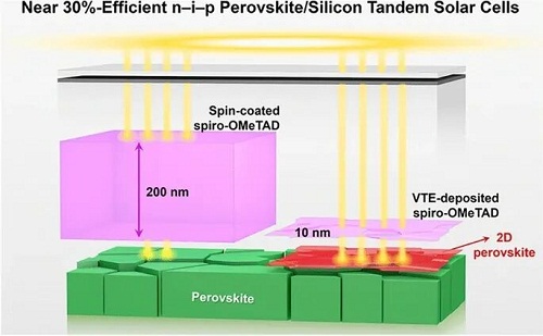 为应对这一挑战,研究人员已经探索了多种策略。一种方法是采用复合HTL,减少spiro-OMeTAD的比例或者采用更宽带隙的HTL材料,从而降低HTL的光学吸收,但是效率还未体现明显的优势。另一种策略则聚焦于减少HTL的厚度。其中一种可行的方法是采用真空热蒸发(VTE)制备spiro-OMeTAD的HTL。这种方法可精确调控HTL的厚度,当采用多源共蒸镀可以实现掺杂从而制备高效器件。然而,薄膜的导电性与掺杂剂、薄膜厚度之间还存在制约关系,难以同时实现超薄、无漏电、低寄生吸收的HTL,共蒸镀也增加了工艺的复杂度。因此,探究n-i-p叠层电池中HTL的材料和厚度窗口,优化HTL的光学与电性能权衡,对于探索高效率的n-i-p钙钛矿/晶硅叠层电池具有重要意义。