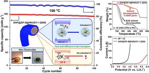 本研究通过一维MOF模型研究,结合实验分析与神经网络势函数模拟,为纳米孔道内锂溶剂化结构的限域效应提供了直接科学证据。基于此,我们设计了一种具有分级核壳结构的创新型MOF基准固态电解质(QSSE),该结构将ZIF-8核与HKUST-1壳构筑于GHF隔膜上,形成多重连续离子传导通道,显著提升了Li⁺传输效率、热稳定性及电化学稳定性。其中,ZIF-8核促进Li⁺快速去溶剂化,而HKUST-1壳则稳定溶剂化Li⁺,从而实现高效离子传导、均匀Li⁺迁移及枝晶抑制。该QSSE表现出高离子电导率(2.43 × 10⁻⁴ S cm⁻1)、高锂迁移数(0.65)、优异的热稳定性(耐受超过200°C)及宽电化学窗口(约5.3 V),确保了其高安全性与长循环寿命。与LiFePO₄正极匹配时,QSSE在100°C高温下循环100次后容量保持率高达97%,展现出在极端条件下的卓越性能。本研究为理解MOF结构内锂离子的溶剂化与传输机制提供了重要理论基础,并为可扩展的高性能QSSE设计开辟了新路径。