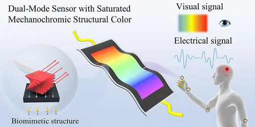 1. 仿生设计,功能集成: 模仿暗冠蓝鸦羽毛的黑色素增强结构色机制,利用黑色导电水凝胶基底增强羟丙基纤维素的结构色,开发出集应变传感与力致变色于一体的双模态传感器。
