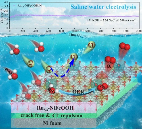 2. 原子级分散,抗蚀增强:原子级分散的Ru单原子(RuSA)嵌入NiFeOOH基体,通过静电排斥与局部Cl⁻富集效应,保护相邻Ni/Fe活性位点免受Cl⁻侵蚀。
