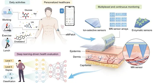 为了解决这些问题,研究团队开发了一种eMPatch系统,将模块化微针与柔性电子、机器学习完美融合。
