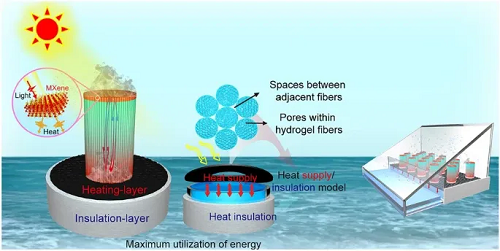 图1. 具有高度垂直和多级孔隙结构的水凝胶纤维蒸发器及“供热/保温模型”。