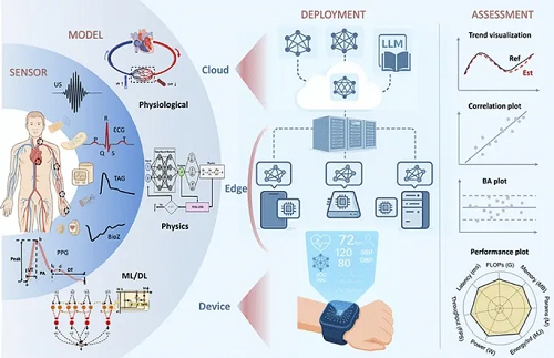 图1. AI赋能可穿戴血压监测的“传感-模型-部署-评估”协同设计框架。