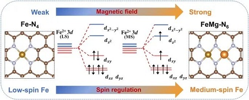 1. 自旋精准调控,协同催化增效:邻近Mg位点的引入诱导Fe自旋态从低自旋转变为中自旋,优化了*O₂的吸附与*OH的脱附,从而加速了四电子氧还原反应路径。