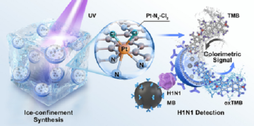 中国科学院深圳先进技术研究院周文华等人聚焦单原子纳米酶(SANs)在生物功能化过程中催化活性易受损的核心挑战,创新性地提出了“轴向配位工程”与“脂质体非接触封装”协同集成策略。通过低温光化学法在脂质体内部原位构建了具有独特轴向PtN₃Cl₂配位结构的铂单原子纳米酶,经同步辐射X射线吸收谱学证实,该结构优化了铂活性中心d带电子态,极大地提高了其自身的氧化酶模拟效率。更重要的是,脂质体封装实现了催化中心与生物识别元件的空间隔离,通过在脂质体表面偶联抗体实现“非接触”功能化,有效避免了对单原子活性位点的占据或屏蔽,使得功能化后的纳米酶米氏常数(Kₘ)较传统策略降低50倍,极大保留了信号放大效能。基于此,所构建的免疫传感器实现了对甲型流感病毒(H1N1)、SARS-CoV-2等呼吸道病原体抗原fg/mL量级的超高灵敏度检测,并获得与RT-qPCR高度一致的临床验证结果。该工作通过“轴向配位-脂质体封装”协同策略,成功突破了单原子纳米酶在生物功能化过程中活性易损的瓶颈,为构建高性能、高稳定性的纳米酶生物传感系统提供了新思路。