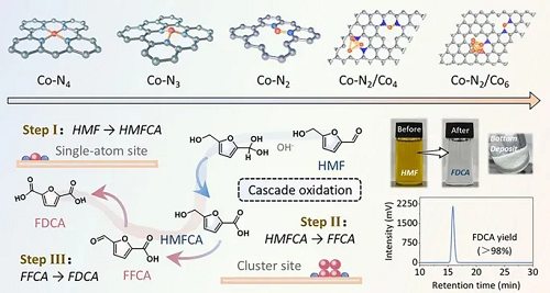 2. 协同增效,创纪录性能:阐明了原子/团簇双位点的协同催化机制。其中,Co-N₂位点选择性活化醛基驱动连续羧酸化,而Co₄团簇则增强氧活化以加速羟甲基氧化。该协同作用使Co-N₂/Co₄双位点催化剂在55°C的温和条件下,实现了98.76%的2,5-呋喃二甲酸(FDCA)产率,超越了多数已报道的负载型非贵金属催化剂,并具备优异的循环稳定性。