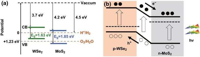 (a) 单层MoS2 和WSe2的能带图及其在水分解还原电势的位置;(b) MoS2/WSe2异质结(II型交错式异质结)的光生载流子分离机理的示意图。