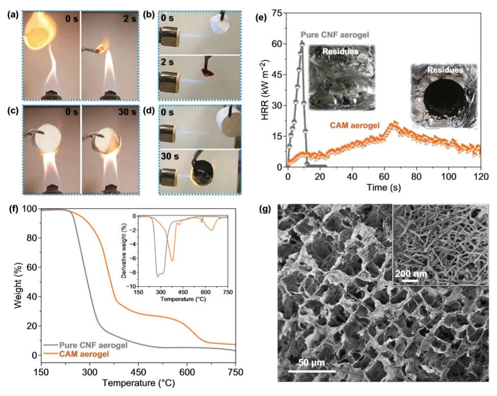 金属有机骨架(MOF)是一类新兴的多孔材料,它通过配位键通过含金属的节点和有机配体连接在一起。利用其高孔隙率和多样结构的优势,MOF在气体存储和分离,空气净化,能量存储等方面受到了广泛的关注。例如,由于MOF具有丰富的微孔和混合结构,它们在理论上是有前途的绝热材料,但是,纯MOF的绝热应用很少得到开发,主要原因是是由于MOF晶体难以成型和加工。表面上含有有机官能团的纤维素纳米纤维CNF是进行表面纳米工程修饰的理想底物,为克服长期以来与CNF基材料相关的湿度敏感性,可燃性和较差的机械性能带来了机遇。因此,研究人员尝试将两种材料复合,得到的CAM气凝胶在隔热和防潮测试中表现出色,并且具有超弹性,高机械强度和阻燃性。
