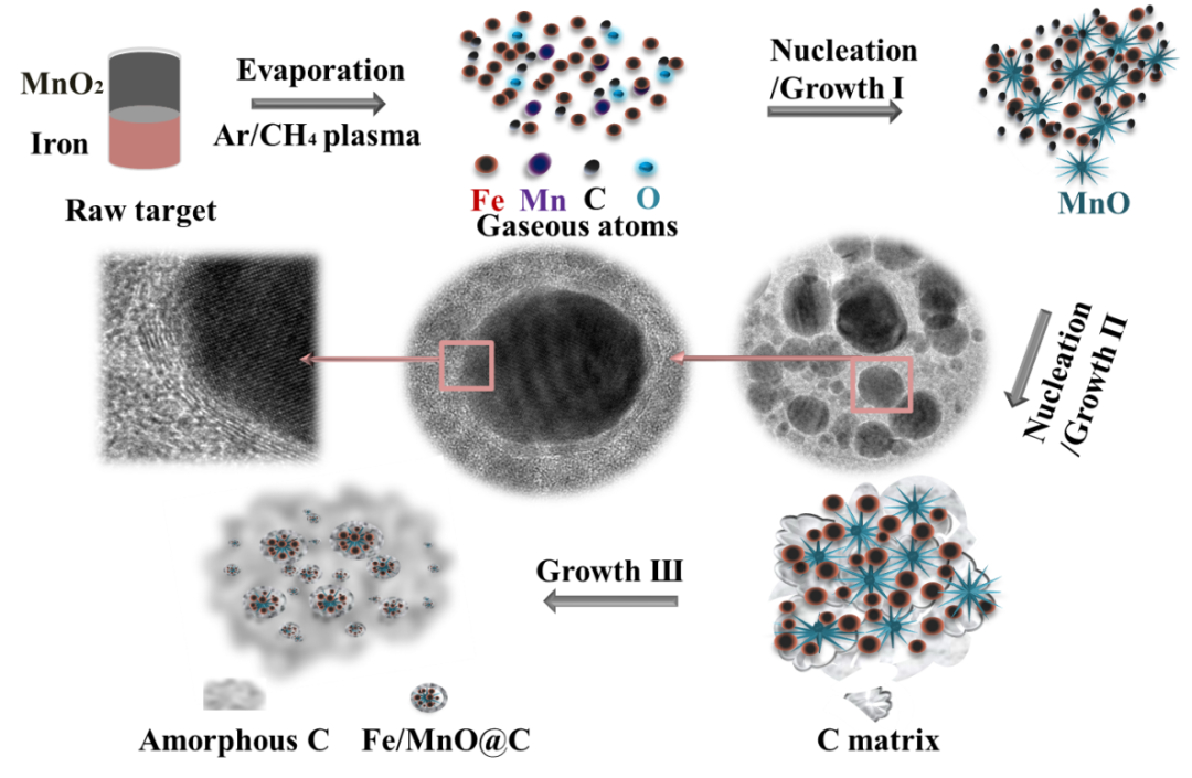 嵌于无定形碳的Fe/MnO@C纳米胶囊复合物的形成过程分为三个阶段,即蒸发、成核/生长和催化石墨化。在第一阶段,用高能电弧等离子体将Fe和MnO2、气态CH4的原料共同完全蒸发成气态原子。在第二阶段,原始物种的蒸发原子将有序地进行成核和生长。在最后阶段,铁的催化作用使铁/MnO纳米晶附近的非晶态碳转化为结晶石墨。