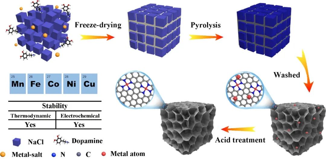 如图1所示,通过NaCl-模板法合成一系列3D M–NₓCs材料。首先将NaCl、盐酸多巴胺和金属盐溶于蒸馏水中,室温下磁力搅拌形成均相溶液。随后,将上述溶液进行冷冻干燥处理,得到干燥粉体。在冷冻干燥过程中,立方晶相的NaCl晶体首先析出作为3D硬模板,伴随着水的升华,NaCl晶体被多巴胺和金属源包覆。随后,将粉体在Ar气氛下800℃碳化处理,碳基体中掺杂的N物种和金属粒子可以通过金属原子的d轨道与N原子的孤对电子之间的强配位相互作用来固定金属单原子,形成的M–NₓC基团,均匀分散在3D M–NₓC材料中。最后,通过酸蚀刻除去NaCl模板和金属纳米颗粒,合成了含有均匀分散的金属单原子的三维蜂窝状M–NₓCs材料。该合成策略主要采用了冻干、碳化、酸性蚀刻等工艺,制备方法简单,易于实现M–NₓCs的大规模生产。通常情况下,每批可以制备超过1.0 g的3D M–NₓC材料。