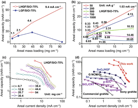 图5. (a) LHGF/SiO-75%和LGF/SiO-75%电极在100 mA g⁻¹时的面积容量与质量负荷的关系;(b) LHGF/SiO-75%电极在不同电流密度下的面积容量与质量负载的关系;(c) LHGF/SiO-75%电极在不同质量负载下的面积容量与电流密度的关系;(d) LHGF/SiO-75%电极与不同类型合金型负极的面容量性能对比。